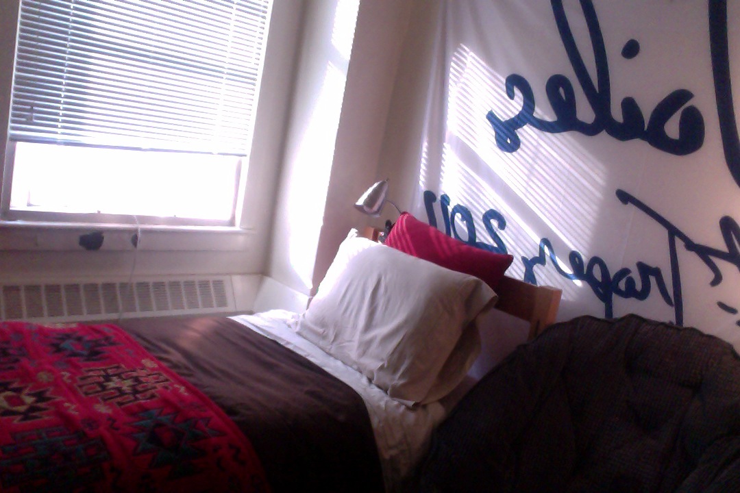 Music aside, Sturdy put quite a bit of thought into making the small space home. The monumental blue and white flag that hangs behind his bed come from a boat that his father sailed in St. Tropez, while his bedding and lantern are from his parents’ marine travels in Tunisia. In addition to foreign treasures, Sturdy’s room is equipped for relaxation and hours spent reading. “The chair comes from ‘Nemain Tar-jay,’” he joked of the silvery moon chair that completes his lounge space.
