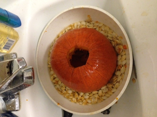 - Cut out the stem of the pumpkin, scrape out as much of the guts as you can, but focus on the seeds.
