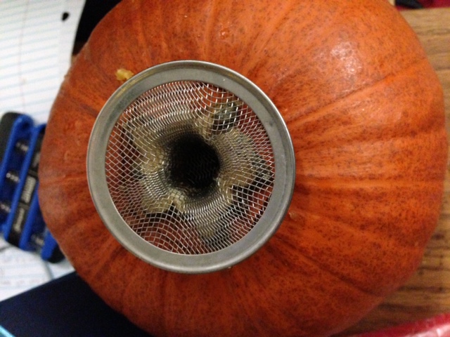 - Fit the strainer into the cap and snugly place into the pumpkin.