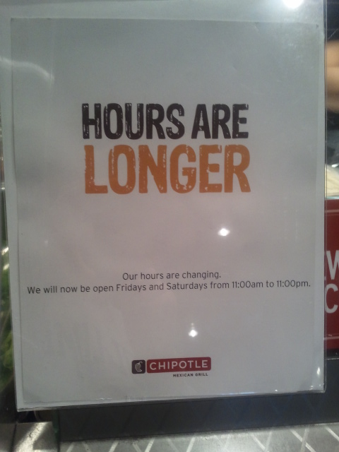 - First the good news: Chipotle is open longer on Fridays and Saturdays!