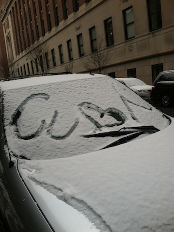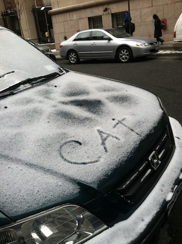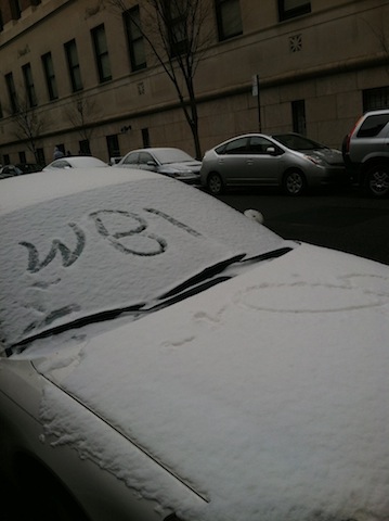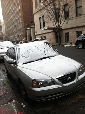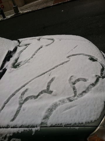 What better way to express yourself than on the hood of a stranger’s car? A sampling of the art that last night’s flurry inspired: