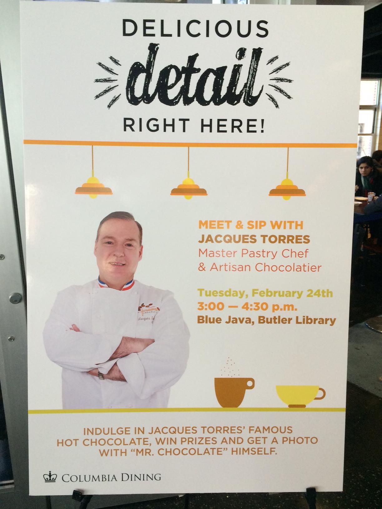 Overseen in Ferris: Master Pastry Chef and Chocolatier (according to his Twitter) Jacques Torres will be coming to Butler Cafe next Tuesday, February 24th from 3 to 4:30 pm. Also known as Mr. Chocolate, Torres is well-known for his cocoa creations, and he has eight locations throughout NYC. Treat yoself this midterms season and be sure to head over to ButCaf next Tuesday, and in the mean time, ButCaf is selling two kinds of hot chocolate (one of these flavors is called “Wicked”) and other treats by Torres.
