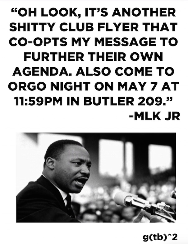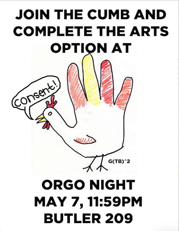 Following what we can now fortunately consider to be a regrettable preview, we are pleased to announce the official Spring 2015 Columbia University Marching Band Orgo Night event posters, sure to join their predecessors in offending and inspiring those portions of campus that will still give a shit amongst finals.
