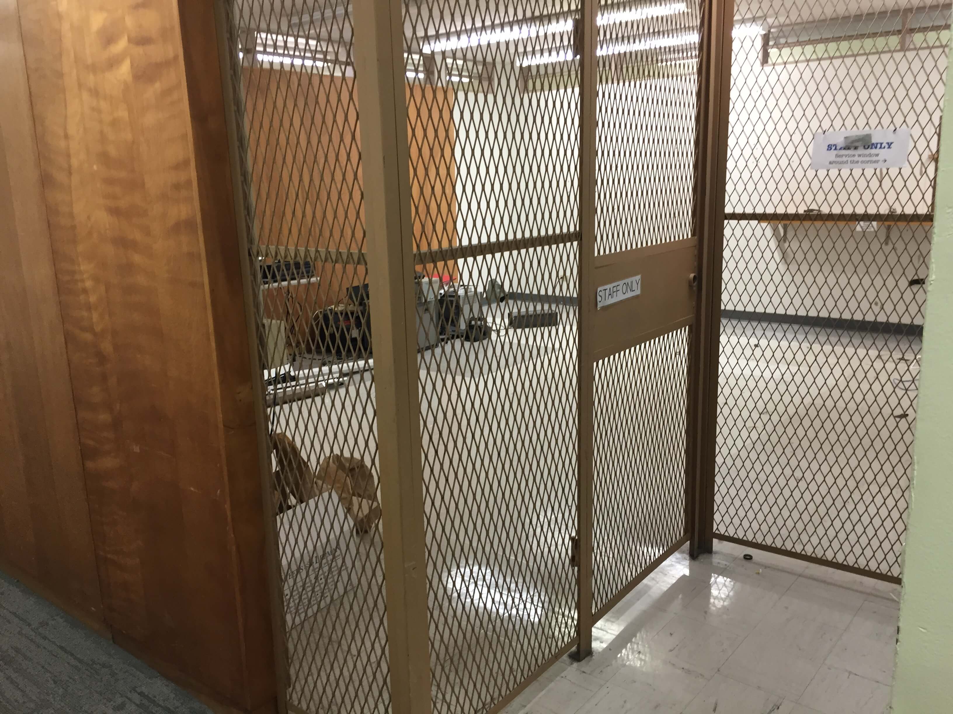 - A creepy cage on the third floor. The sign says “STAFF ONLY,” but since a number of door knobs are missing from Lehman, the sign might as well say “COME IN.”