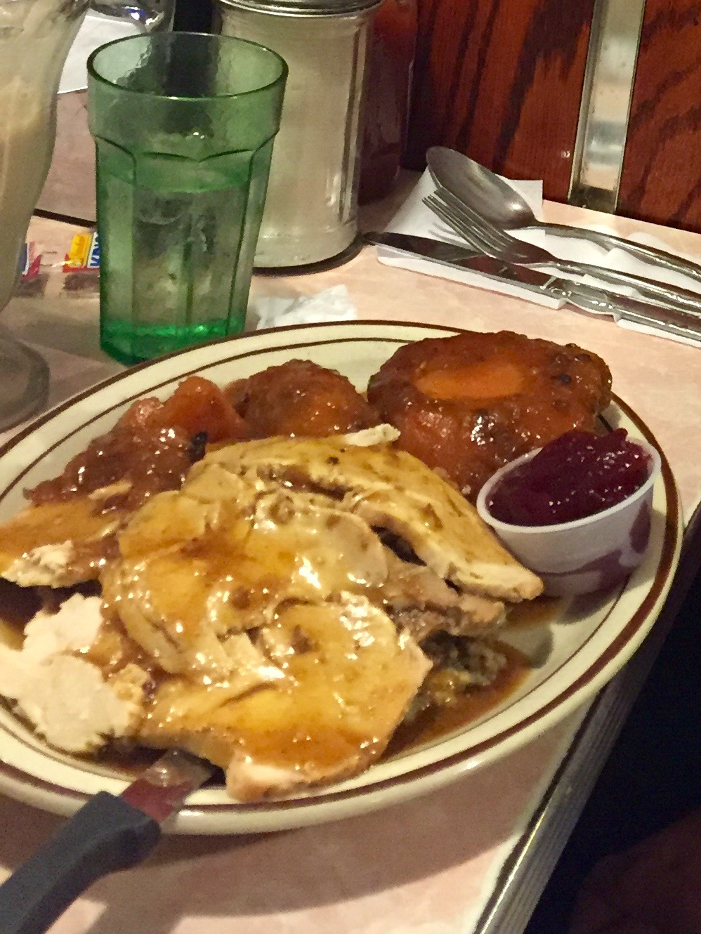 Did you know Tom’s serves a $22 five-course Thanksgiving dinner? Twenty other patrons joined us in our exclusive holiday dining experience Thursday evening. Each meal appeared to be served in a timely manner, coming out approximately three minutes after each order was placed. The meal itself consisted of a house soup and salad, canned veggies, a yam sweet potato orange starch of some sort, white and dark meat turkey, “stuffing,” cranberry sauce, and a slice of pumpkin pie, which never actually made it to our table. This is definitely what the pilgrims intended, right? Check out the main course of Tom’s dope Thanksgiving dinner below!