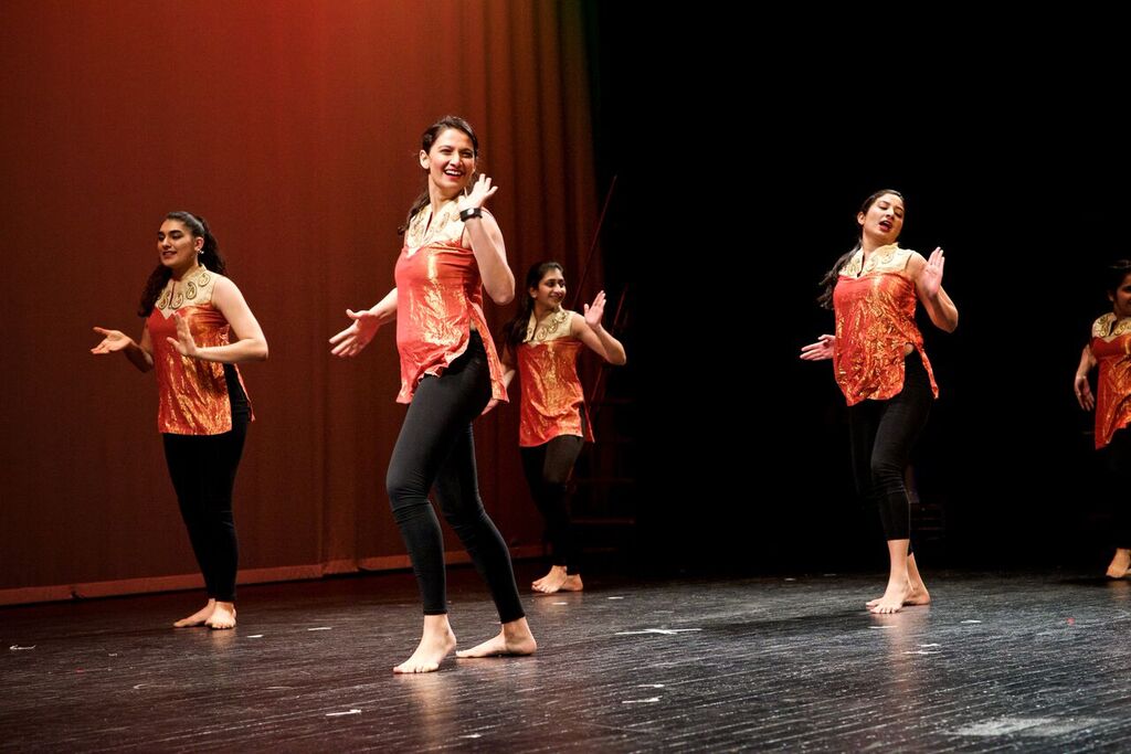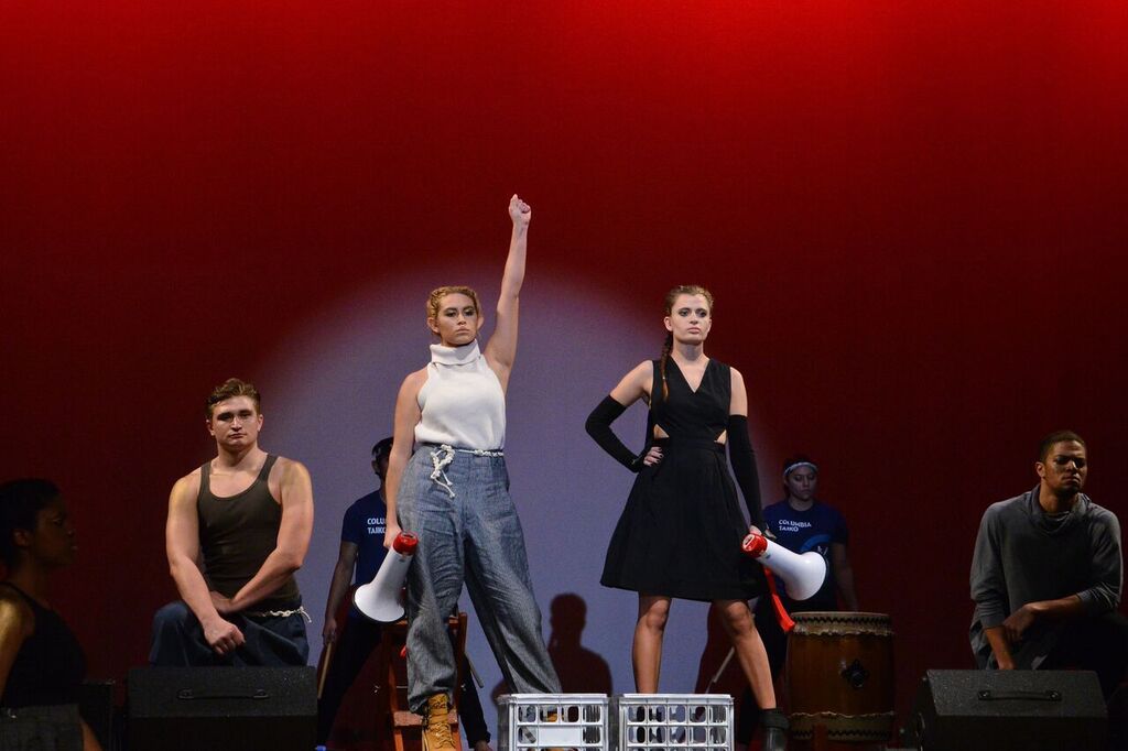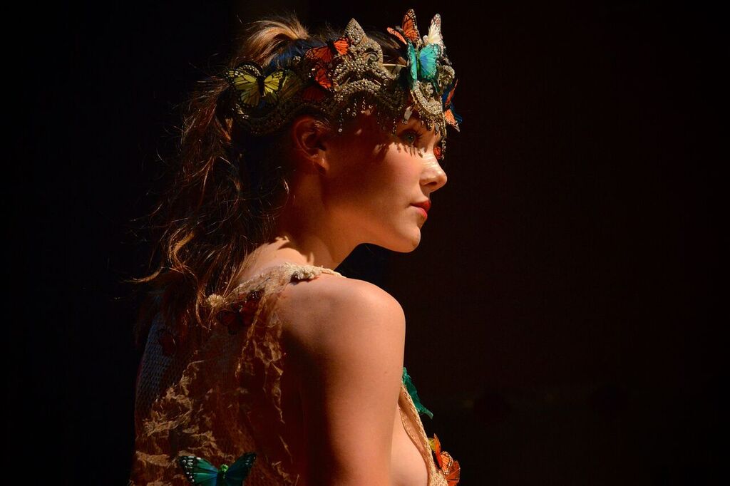 The night took a particularly interesting turn with the final scene, which featured sustainable and environmentally friendly fashions, all produced by local artists, including a vast amount of student-created artwork. This was an incredibly special scene to witness, because it tied in to our zeitgeist as Columbia students and particularly showed our dedication to sustainable fashion. Lead makeup director Anisa Tavangar is a major part of Hoot, Columbia’s fashion magazine, which also featured an article on sustainable fashion in last semester’s edition. Lunar Gala’s fashion show this year was comprised of four unique looks, which Anisa’s team spent hours bringing to fruition. However, all of the looks maintained a sense of unity by incorporating bright, gold detailing and edgy hair.