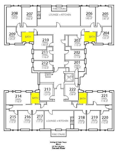 - Total of 127 singles and one walk through double on the first floor. There are around thirty “big” singles and 97 smaller singles. Room sizes range around 110-145 sq. ft.