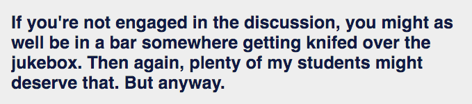 CULPA is your friend who has taken every class with every professor and can tell you how much of the reading you actually have to do, if the professor’s voice will put you to sleep, whether the class is worth taking, ect. Usually the site gets the most traffic at the end of each semester during course selection, but teacher quotes like this make the site worth visiting year-round. Lit Hum Professor David Yerkes in particular has exceptionally funny quotes, especially being that they are posted out of context. Here are some of our favorites: