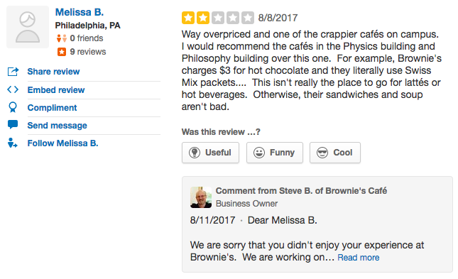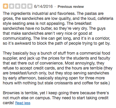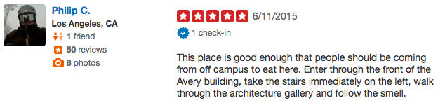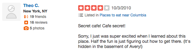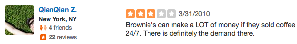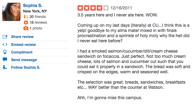 I was googling the hours of Brownie’s Café the other day, and lo-and-behold, I stumbled upon a treasure trove of actually helpful Yelp reviews. You’ve probably read the highlights from our analysis of Yelp and Google reviews of Columbia University overall, but here’s the best (and worst) take on a specific, infamous (famous?) Columbia institution: Brownie’s Café. And yes, Brownie’s does have a four-star Yelp rating.