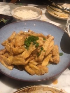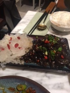 The “appetizers,” which came in the middle of our meal, were pretty fantastic. The dan dan noodles were, again, very sweet. This seemed to be a fairly “Americanized” dish compared to others on the menu. There was a perfect amount of sauce that left the noodles neither too dry nor too soggy, and the vegetables that were blended in complemented the flavorful other ingredients quite well. The fungus was a bit unlike anything I had tried before, but I thoroughly enjoyed it. The white fungus was a bit flavorless and worked best as a palate cleanser of sorts, but the black fungus was both sour and spicy as promised. I saved this dish for the end, which was a mistake, as I wasn’t able to have more than a few bites of it. I would consider it a highlight of the meal, though; both basic and creative, the flavors clashed with everything else that I had taken in—but in the best way.