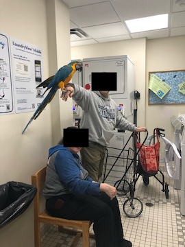 Whether you’ve been shuttling your socks to Wien or turning them upside down and inside out, this, and the other stack of maintenance issues, blows!!!! Perhaps the residents should cart their clothes over to 600 instead, where the following parrot was spotted doing HIS laundry: