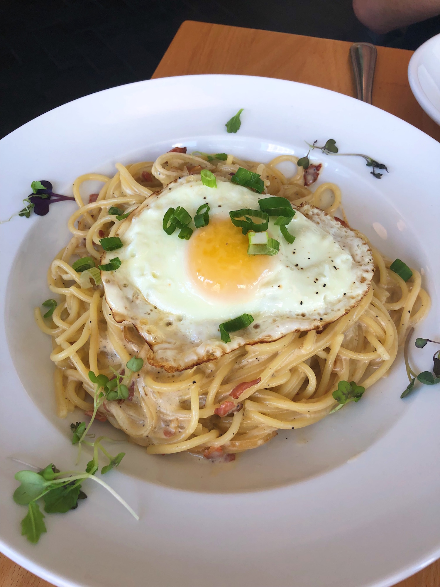 The next was the Breakfast Carbonara. This was essentially carbonara pasta with a fried egg on top. I had just watched a YouTube video the night before on how to make carbonara (it’s actually REALLY complicated), so I had to get this dish. I wouldn’t say their carbonara was outstanding or anything special. It was just carbonara, and it was a little on the bland side. The egg was a good idea, but only the first few bites of the pasta have egg. Afterwards, it’s just normal carbonara. The egg also wasn’t runny enough to get the egg flavor throughout the pasta. Still, the pasta was pretty good and creamy, and a good level of al dente.
