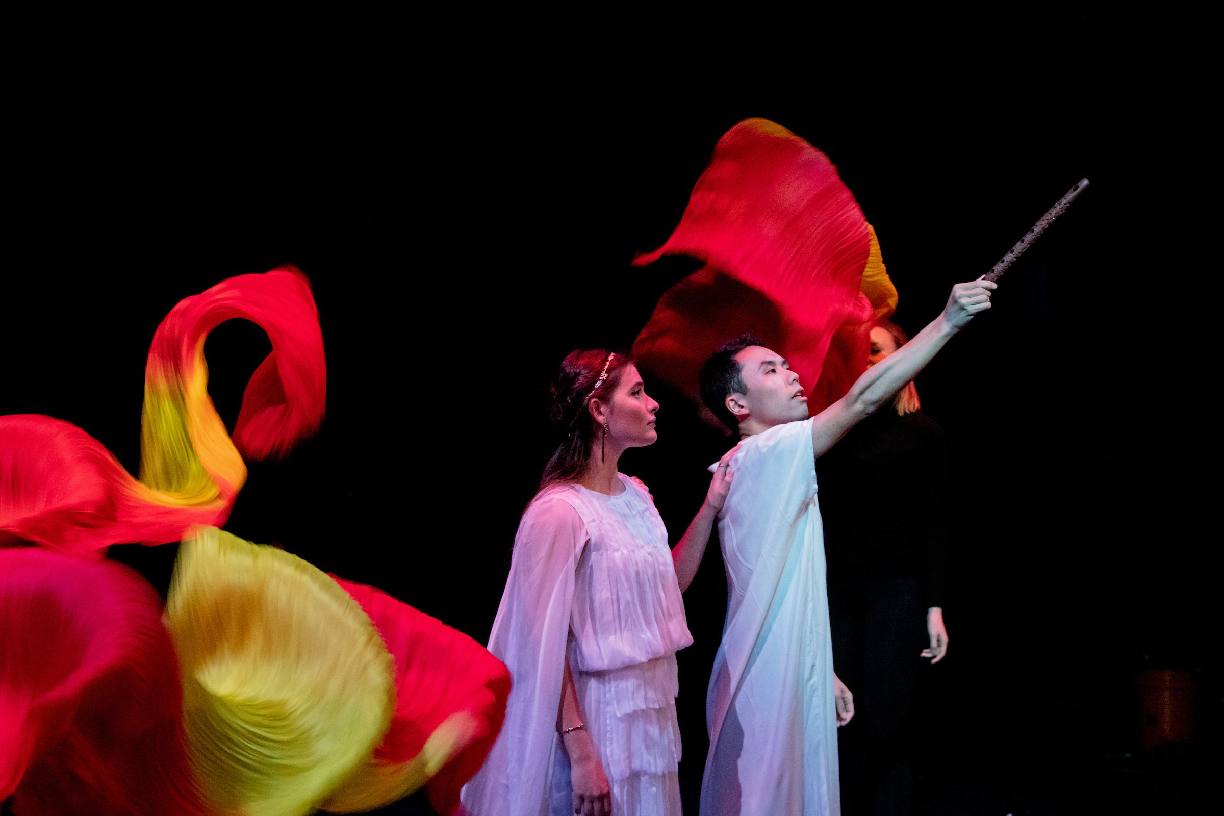 The costumes by Becca Li (SVA ‘20) were wonderful— the Queen of the Night’s dress, complete with dramatic train, was a standout, as were the outfits worn by the chorus (complete with LEDs that made the audience gasp!). Props (managed by Haoqi Xia CC ‘20, who also sang as a countertenor in the production) were very fun: a serpent made of paper lanterns, fabric fans to signify water and fire, a glittering dagger.