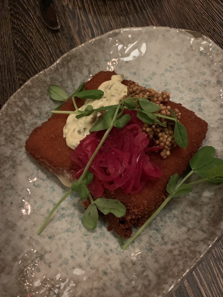 Peeking at the menu again, we stopped at the “Crispy Gruyere Cheese.” Gruyere cheese is usually very soft and gooey, so making it crispy was an interesting concept to us. Eli, the owner, stopped by and told us that this was one of their best appetizers. It was previously served at Infamous Bistro and since it was so popular, they decided to keep it. At $17, it was pretty pricey for the size and amount. The cheese came in a flat square, essentially a square-shaped mozzarella stick. It was topped with tartare sauce, pickled onions/shallots, and something that resembled dijon mustard seeds but did not taste like mustard at all. Please email tips@bwog.com if you know what this substance is.