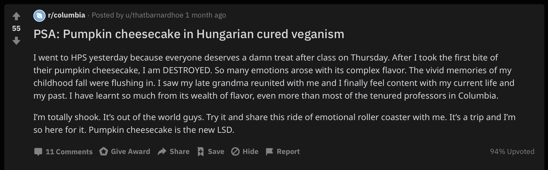 - PSA: Pumpkin cheesecake in Hungarian cured veganism: Wow. The power that that has. Funny enough, I’ve never actually been to HPS. Where is it? Is it a myth? This Redditor seems to have found salvation within…
