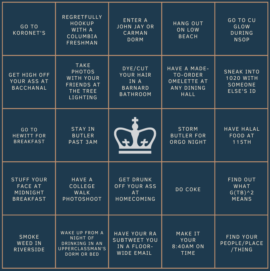 To be real for a second, I know I and other first-years are devastated to see our freshman year of college come to an abrupt end — although for valid, understandable reasons. As someone who struggled for a long time to find a place that was welcoming and accepting (i.e. everything my hometown isn’t) and spent years and years of hard work trying to get here, having it ripped out from under me feels like all 18 years of my life were for nothing. But the benefit of being a freshman means that I have 3 more years of life to dedicate to memories and experiences that I didn’t get this time around. So, instead of sitting around and thinking about what could’ve been, why not do what Bwog does best and make something fun out of it? Here is the first-ever “Things We Never Did But Probably Should’ve/Wanted To” bingo for first-years/transfers/hermits/anyone/everyone. Enjoy!