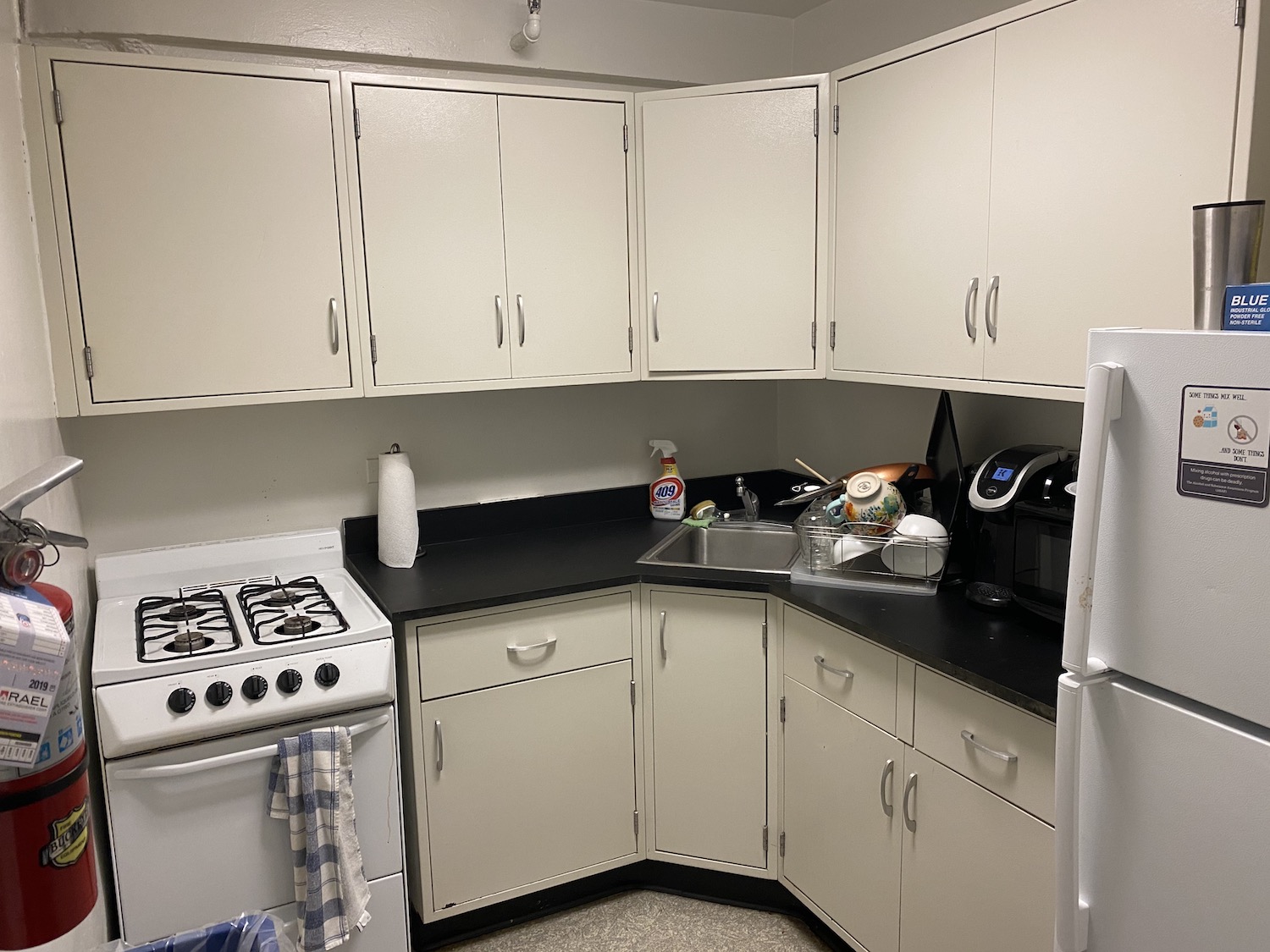 - Kitchen: There is one kitchen per suite which includes a refrigerator, an oven with a gas stovetop (four burners), and a decent amount of cabinet and counter space. The kitchen is a great asset but can feel crowded with more than two people in it.