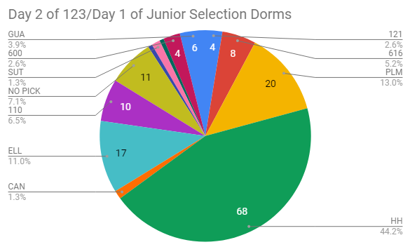 In the second day of the 123 room selection, juniors have wiped out all Elliot, 121, 616, CG, and Plimpton singles. There are still many rooms available, however, they are mostly doubles.