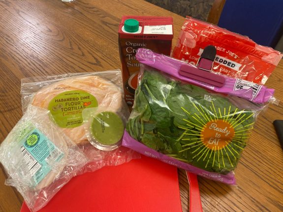 - One large tortilla. Here, I decided to try out the Trader Joe’s Habanero Lime flavored ones, but to be so honest I could not taste the habanero lime even a little bit, so a plain tortilla will do!