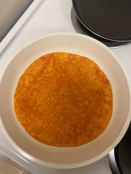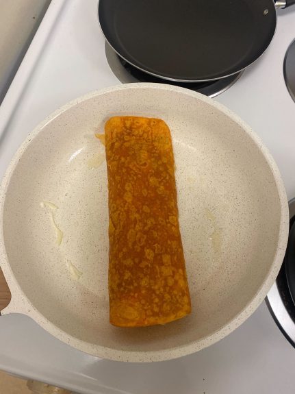 - Place the wrap on a greased pan and toast for roughly 3-5 minutes on each side (until golden brown, as pictured below). It’s usually good to start with the folded side down (as pictured below) so the wrap doesn’t immediately fall apart.