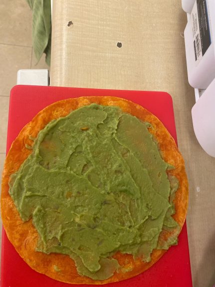- Once the tortilla is warmed, spread your guac or avocado mash into a thin layer covering the tortilla.