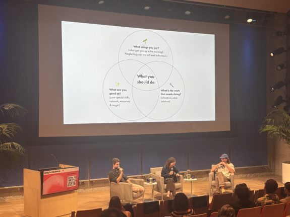 Along the same lines, Met and Abramson mused on how to get people to care about climate change, an issue that can feel outside the scope of their lives. Met acknowledged that fighting climate change is not usually an issue people are considering in their day-to-day lives. He emphasized the importance of getting people concerned about the effects of climate change that directly impact their lives.