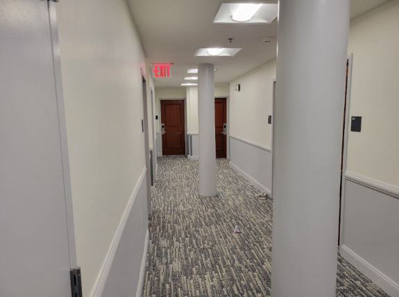 Before the renovations, floors 4-5 (connected by a spiral staircase) contained a two-story Psychology Department hub containing some offices. The locked door to this area has stayed the same, but now there are various “Keep Out” signs attached, along with building permits. From what I saw, construction is still underway, with workers coming in and out. The room itself is dark, and its windows are mostly boarded up.
