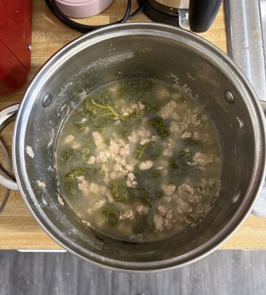 I decided to make some comfort food this week after breaking my shoulders carrying groceries. This recipe for turkey, kale, and white bean soup makes four servings of bullshit!
