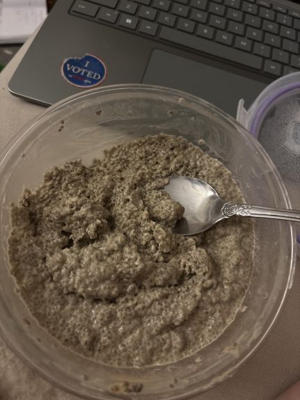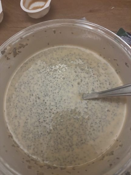- Add in your liquid. The amount depends on how thick you like it, but I find around 1:4 chia seeds to liquid is usually perfect. You should put a bit more if you add protein powder, as mine was WAYYY TOO THICK.