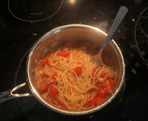 - Stir until all the spaghetti is coated with the sauce/tomatoes. Make sure you let the pasta simmer for a bit with the basil in it.