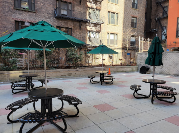 • Outdoor courtyard with metal picnic tables