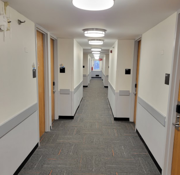 • Flooring: The hallways and lounges have carpet flooring and the dorms have hardwood floors.